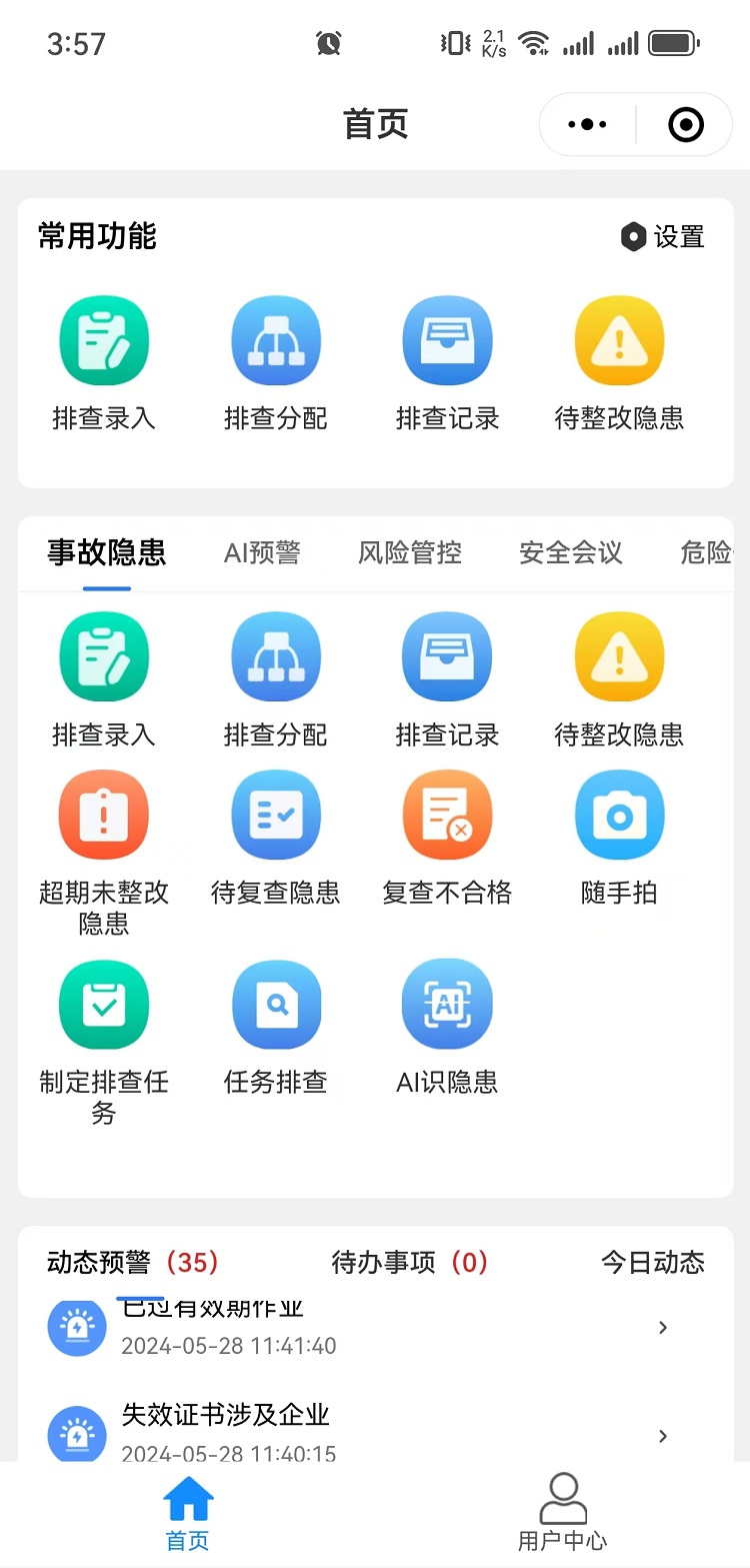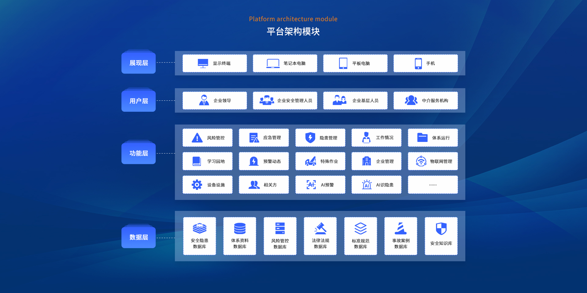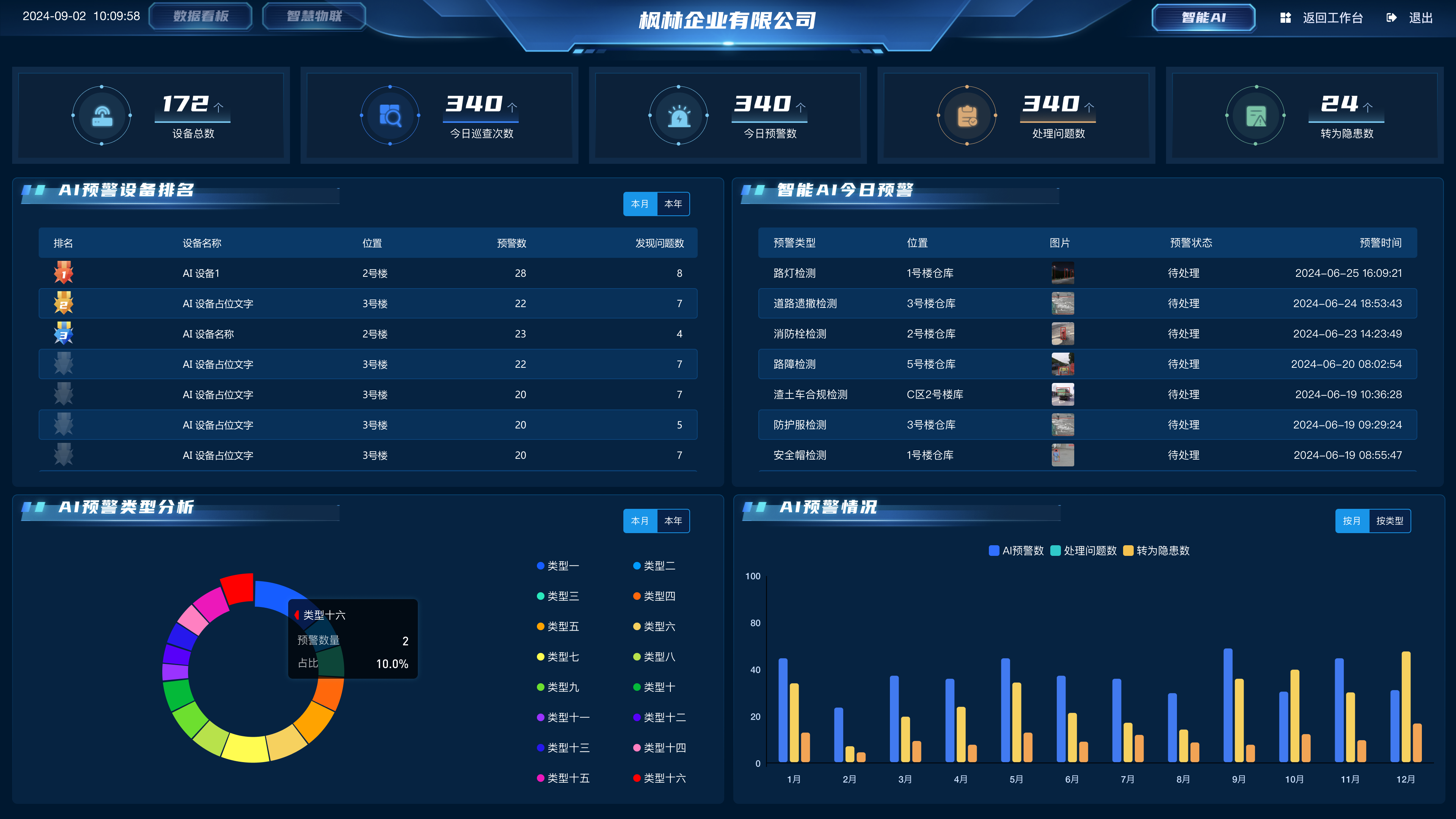 企業(yè)數(shù)智化安全管理平臺(俗稱企業(yè)端)匯集企業(yè)管理、風(fēng)險(xiǎn)管控、隱患管理、體系運(yùn)行、危險(xiǎn)作業(yè)、AI預(yù)警、AI識隱患、應(yīng)急管理、預(yù)警動態(tài)、一會三卡、物聯(lián)網(wǎng)管理、相關(guān)方、設(shè)備設(shè)施、學(xué)習(xí)園地等功能于一體,旨在構(gòu)建標(biāo)準(zhǔn)化、規(guī)范化、便捷化的管理流程,引導(dǎo)企業(yè)自主開展安全管理工作,建立健全全員安全生產(chǎn)責(zé)任制,全面提升企業(yè)安全管理數(shù)智化水平。