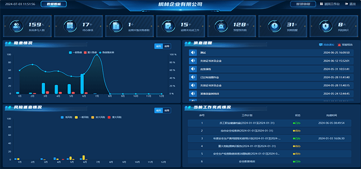 構(gòu)建可視化數(shù)據(jù)中心看板集成匯總企業(yè)安全生產(chǎn)運(yùn)行數(shù)據(jù),涵蓋隱患情況、風(fēng)險(xiǎn)巡查情況、工作完成情況、預(yù)警預(yù)告情況、到期提醒、物聯(lián)報(bào)警等,便于負(fù)責(zé)人全盤掌握企業(yè)安全管理動態(tài)。