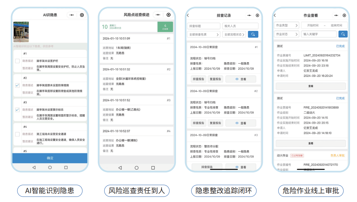 通過信息化流程運(yùn)轉(zhuǎn),借力班前會管理、風(fēng)險(xiǎn)巡查、隱患排查、工作待辦事項(xiàng)提醒等,有序規(guī)范日常工作執(zhí)行流程,實(shí)現(xiàn)安全管理合法合規(guī),降低企業(yè)安全管理經(jīng)營風(fēng)險(xiǎn)。