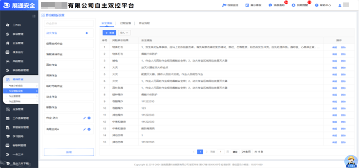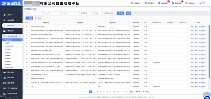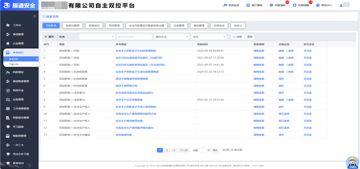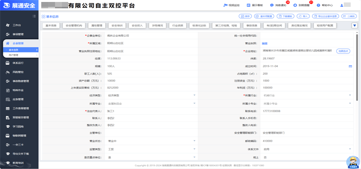 系統(tǒng)提供企業(yè)基本信息、安全管理架構(gòu)、安全投入、涉危情況、行業(yè)資質(zhì)、安全培訓(xùn)、職業(yè)衛(wèi)生、涉塵涉爆、有(受)限空間、第三方檢測、檢驗(yàn)等15個(gè)功能模塊,可根據(jù)企業(yè)實(shí)際情況進(jìn)行選用。