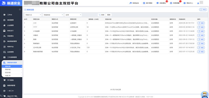 平臺提供隱患管理超期、證照(預(yù))超期、工作計(jì)劃實(shí)施、風(fēng)險(xiǎn)定期巡檢、物聯(lián)感知、應(yīng)急事件等多方面的預(yù)警,依需設(shè)置預(yù)警規(guī)則,支持短信、電話、微信等多途徑消息推送,實(shí)時(shí)提醒相關(guān)責(zé)任人進(jìn)行處理;