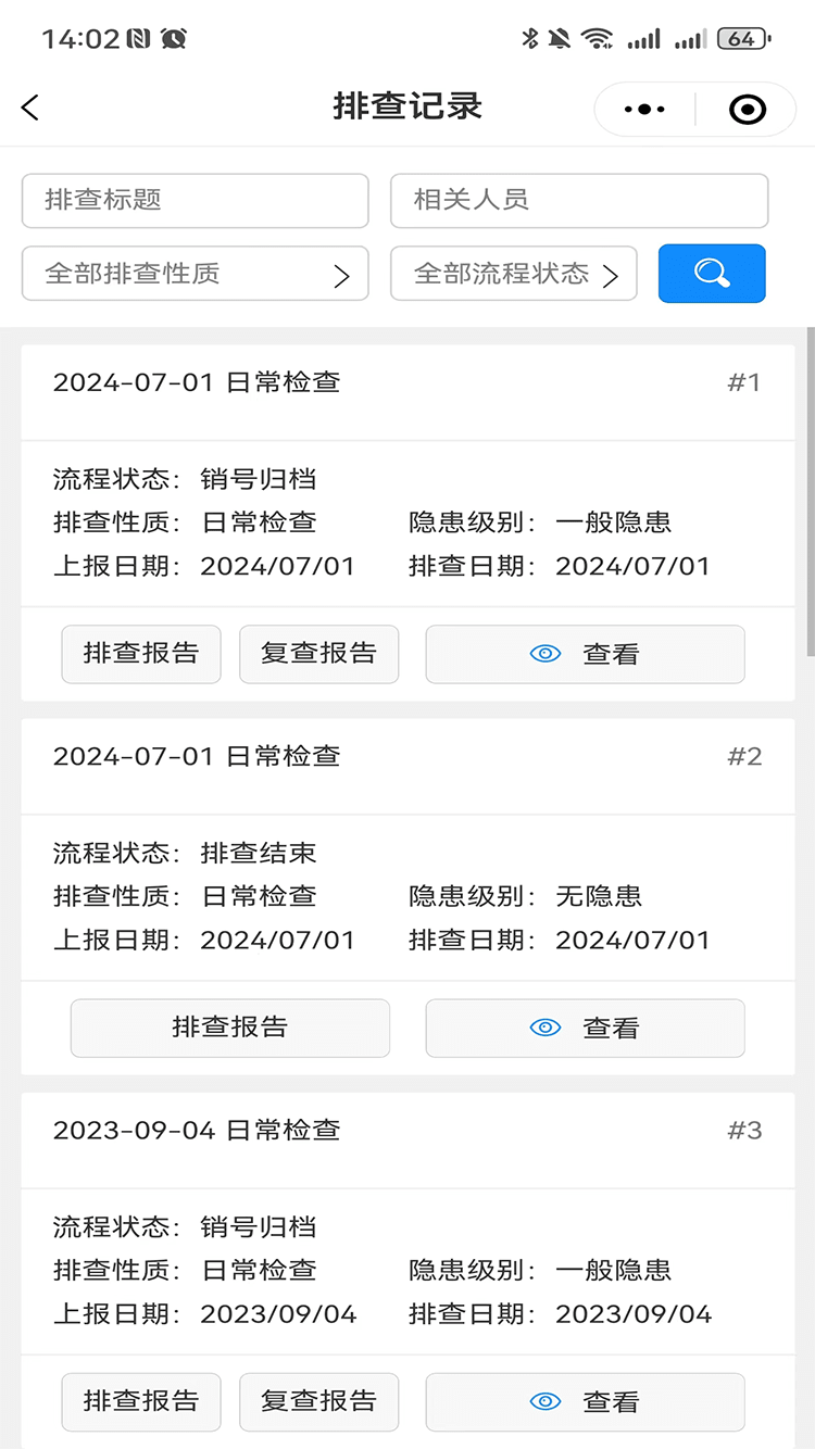 企業(yè)安全管理人員可依托檢查表庫、隱患數(shù)據(jù)庫或者自主新增,完成隱患的排查、上報(bào)、整改、復(fù)查、歸檔等一系列流程運(yùn)轉(zhuǎn),實(shí)現(xiàn)隱患閉環(huán)管理;根據(jù)隱患排查治理信息,自動生成安全檢查報(bào)告,支持線上打印及一鍵導(dǎo)出。